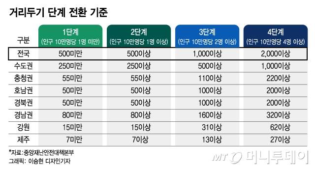 거리두기 단계 전환 기준은 전국의 경우 △1단계 500명 미만(인구 10만명 당 주간 하루 평균 환자 수) △2단계 500명 이상 1000명 미만 △3단계 1000명 이상 2000명 미만 △4단계 2000명 이상 이다.