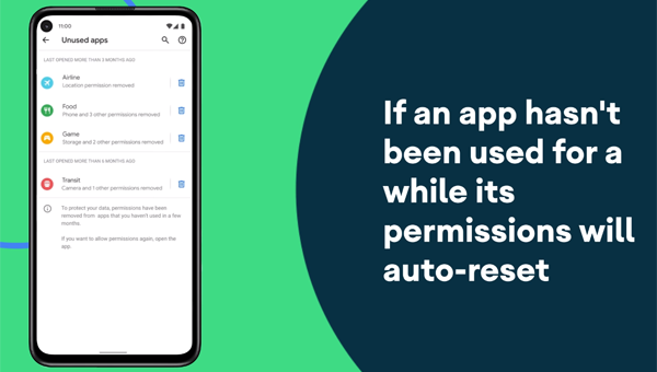 8. 장치에 설치한 앱을 한 동안 사용하지 않은 경우 데이터에 계속 액세스하는 것을 원하지 않을 수 있다. 안드로이드 11은 이제 사용하지 않는 앱에 대한 권한을 '자동 재설정'하고 그에 따라 알려준다. 다음에 앱을 사용할 때 언제든지 앱 권한을 다시 부여할 수 있다.