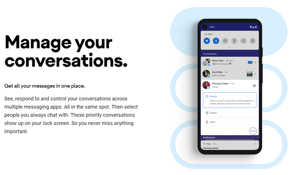 1. 관심있는 사람들과 계속 연락하기 위해 여러 메시징 앱간 전환할 필요없이 안드로이드 11에서는 메시징 앱 사이의 대화가 알림 섹션의 전용 공간으로 이동되어 한 곳에서 대화를 쉽게 관리할 수 있다. 중요한 메시지를 놓치는 일이 없도록 중요 인물의 대화에 우선 순위를 지정할 수도 있다.