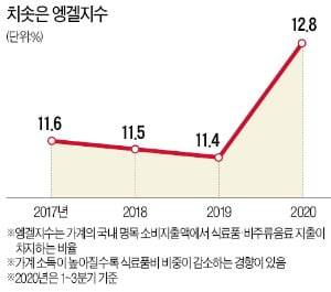 전문가들은 신종 코로나바이러스 감염증(코로나19) 확산을 가장 큰 요인으로 보았다. 코로나19로 인해 카페나 식당 등에서의 만남이 줄어들고, 집에서 식사하는 비중이 늘어났다. 이에 따라 오락·문화 등 여가활동과 같은 서비스 지출보다는 식료품 관련 지출이 늘어나게 되었다. 또한 1인 가구의 급증과 가정간편식(HMR), 밀키트 등 먹거리와 관련한 제품이 다양하게 늘어나게 된 것도 하나의 요인이다. 코로나19로 건강에 대한 관심이 높아지면서 유기농이나 친환경 라벨이 붙은, 비싸더라도 건강하고 안전한 먹거리를 찾는 것도 식료품 지출이 늘어난 배경이다. 이에 따라 ‘엥겔지수’가 20년 만에 최대치를 기록하게 된다. 물론 이러한 현상이 코로나19로 인한 일시적 현상일 것인지, 아니면 인구 구성의 변화와 먹거리에 대한 소비자의 눈높이가 높아지면서 나타나는 장기적인 추세일지는 지켜봐야 할 점이다.