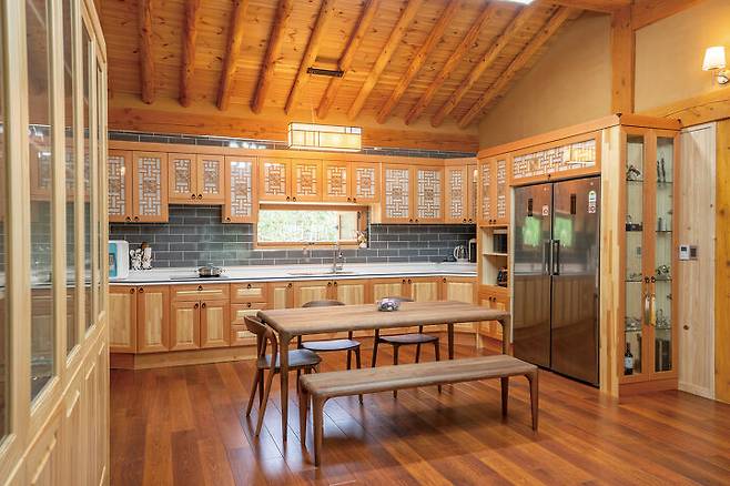 “일자 한옥은 심플한 느낌이잖아요. 심플한 것도 좋지만 특색이 있는 집이길 바랐어요. 그래서 단조롭지 않게 지붕 단을 나눠 달라고 얘기했어요. 실내는 자녀가 오면 머무는 공간, 천장고가 높고 주방과 거실이 뚫려 있어 아파트에선 느끼기 어려운 공간감과 개방감을 요청했어요.”