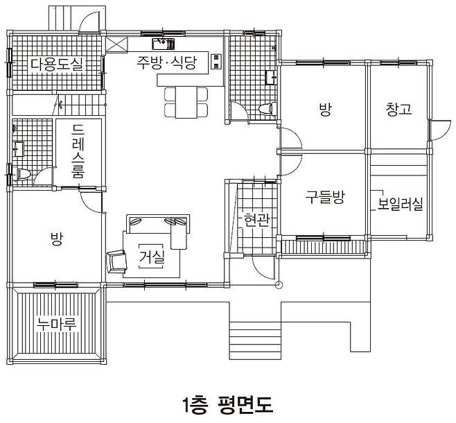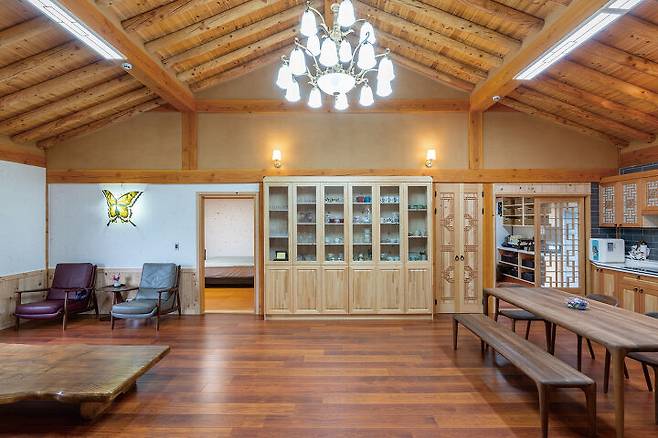 실내는 가운데 공용 공간을 두고 좌우에 개인 공간을 배치했다. 거실과 주방·식당을 ‘一’자로 길게 배치하고 천장고를 높인 후 서까래를 그대로 드러냈다. 주방·식당에서 거실을 보거나, 거실에서 주방·식당을 봐도 막힘없어 공간감이 크다. 주방·식당 옆엔 넓은 다용도실을 배치했고, 거실 옆엔 드레스룸과 욕실, 누마루가 딸린 안방을 뒀다. 공용 욕실은 현관 앞에 구획했고, 그 옆으로 기숙사에 사는 딸이 오면 생활하는 방과 건축주 부부가 몸을 뜨듯하게 지지는 구들방이 있다. 자취하는 아들이 머무는 곳은 안방부터 다용도실까지 길게 이어진 다락이다. 다락처럼 연출했지만, 층고를 한 단 높여 사실상 2층이다. 실내는 물론 실외 곳곳에 나비 조명 등 독특한 소품들이 많은데, 모두 아파트서 살 때부터 아내가 가지고 있던 것들이다.