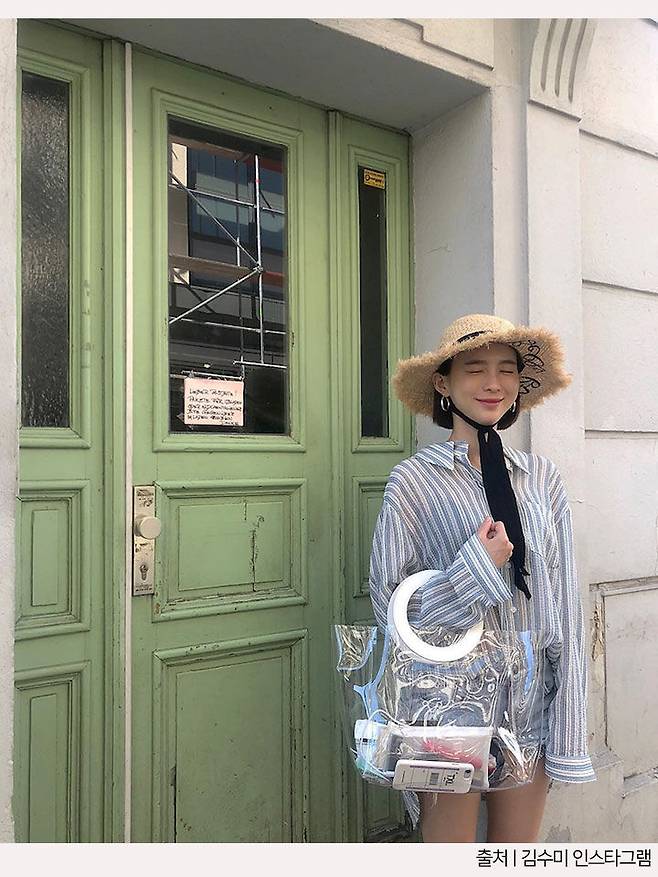 스트라이프 시스루 셔츠와 데님 쇼츠,
