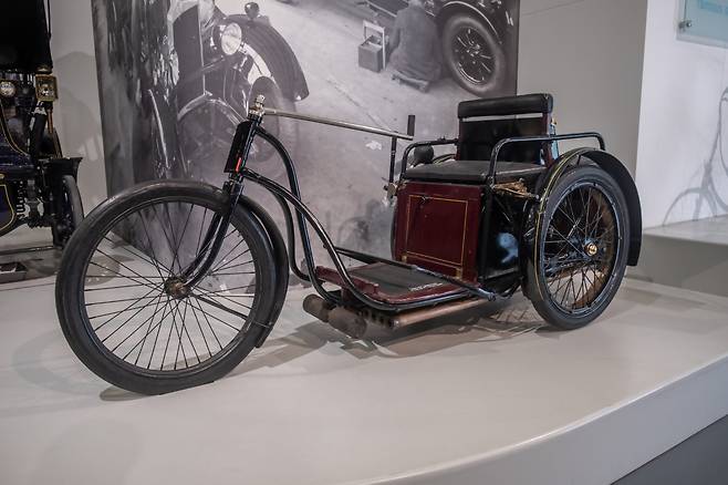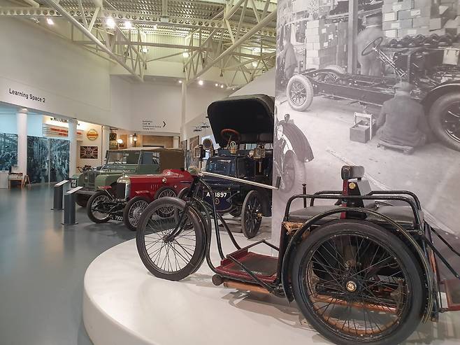 박물관 안으로 들어서면 입구부터 영국을 대표하는 자동차들이 시간을 뛰어넘어 함께 전시된 것을 보게 됩니다. 우선 트라이카(Tri-car)로 분류되는, 마치 자전거를 닮은 듯한 자동차가 눈에 들어오는데요. 영국의 대표 자동차 회사 중 하나였던 오스틴(Austin) 설립자 허버트 오스틴이 울슬리라는 회사에서 일하며 만든 그의 첫 번째 자동차였습니다.