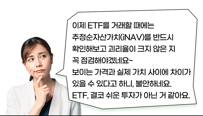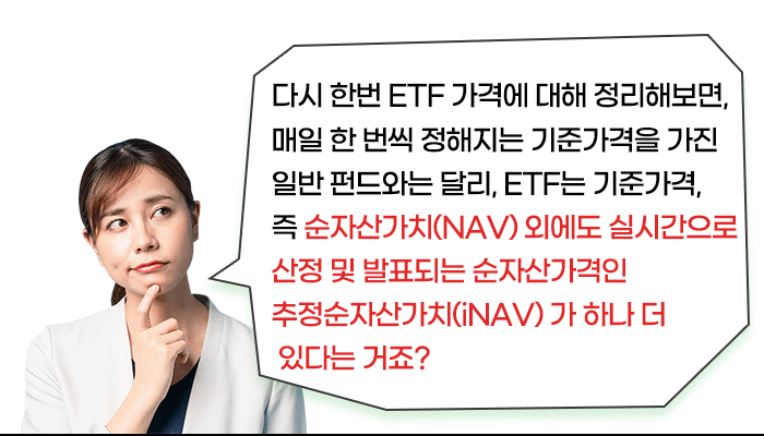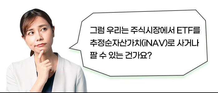 시장의 흐름에 휩쓸리지 않으려면 10초마다 산출되어 게시되는 iNAV를 꼭 체크하고 ETF 주문을 내는 것이 필요합니다.