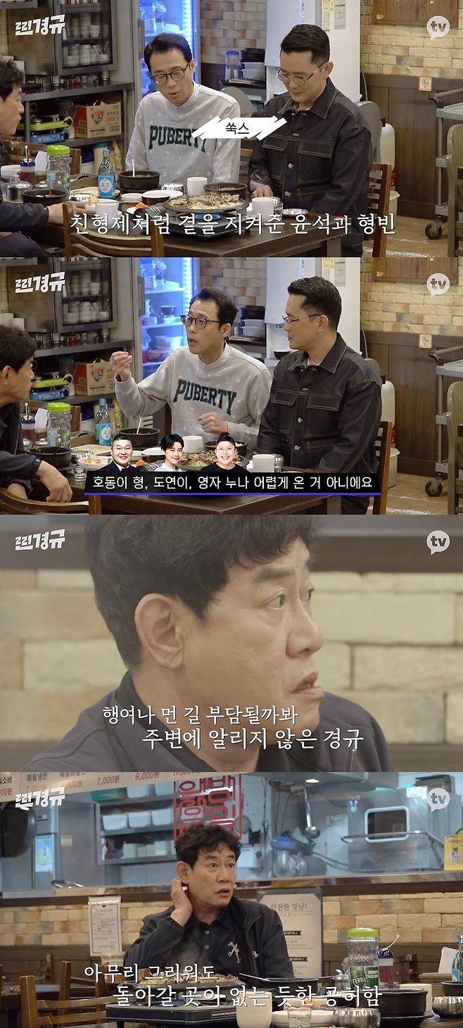 이윤석은 “(강)호동이 형이나 (장)도연, (이)영자 누나가 어렵게 온 거 아니냐. 근데 왜 이렇게 오자마자 ‘왜 왔어. 가’라고 했나”라고 물었다. 이에 이경규는 “미안하니까. 뭐하러 어렵게 오나. 부산이 가까운 길이 아니다. 호동이나 영자는 연락도 안 했다. 갑자기 나타나니까 깜짝 놀란 거다”라고 미안한 마음을 전했다.