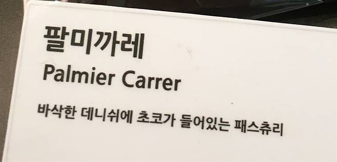 빵집의 메뉴를 '친절하게' 프랑스어로 써주고 싶었나 본데 철자가 틀렸다. palmier carrer가 아니라 palmier carré로 써줘야 한다.