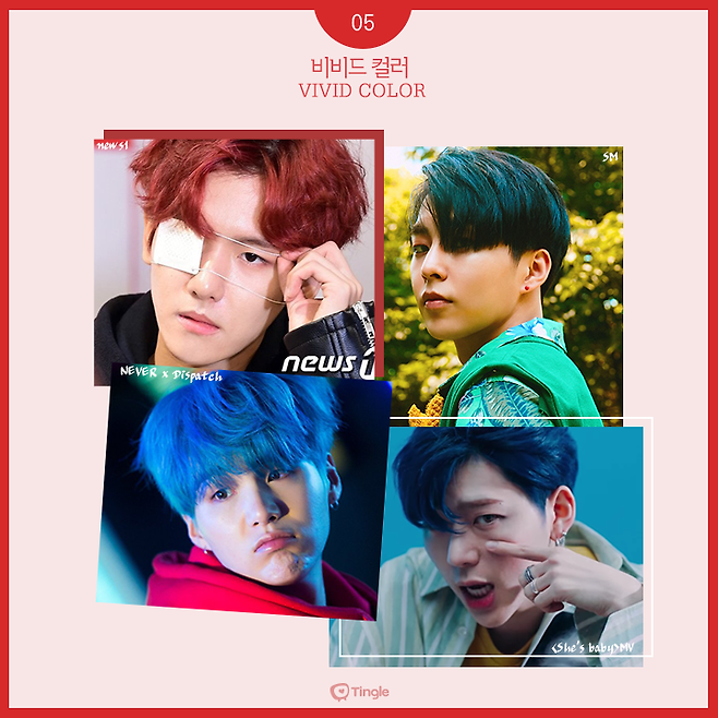 자신만의 개성을 표현할 수 있는 비비드컬러! 엑소 백현, 시우민, BTS 슈가, 블락비 지코까지! 같은 컬러의 염색이라도 자신의 개성에 맞게 분위기를 풍기는게 특징이야.