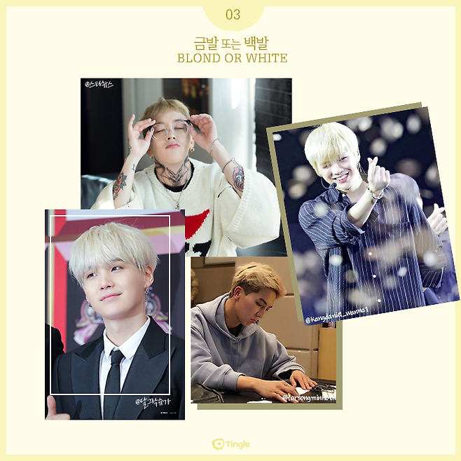 특히 백발은 피부를 더욱 화사하고 뽀얗게 연출해줘! 거기다 멍뭉미는 덤~! 뿐만 아니라 노란기 없는 백발이나 금발은 세련된 이미지 더해줘 많은 아이돌들이 거쳐간(?) 컬러이지!