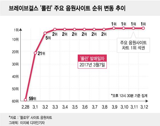 아이돌 가수 브레이브걸스의 '롤린' 순위 역주행에 오리온 주식 게시판이 뜨겁다.