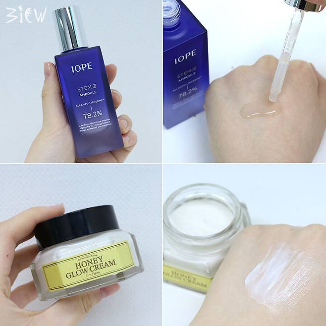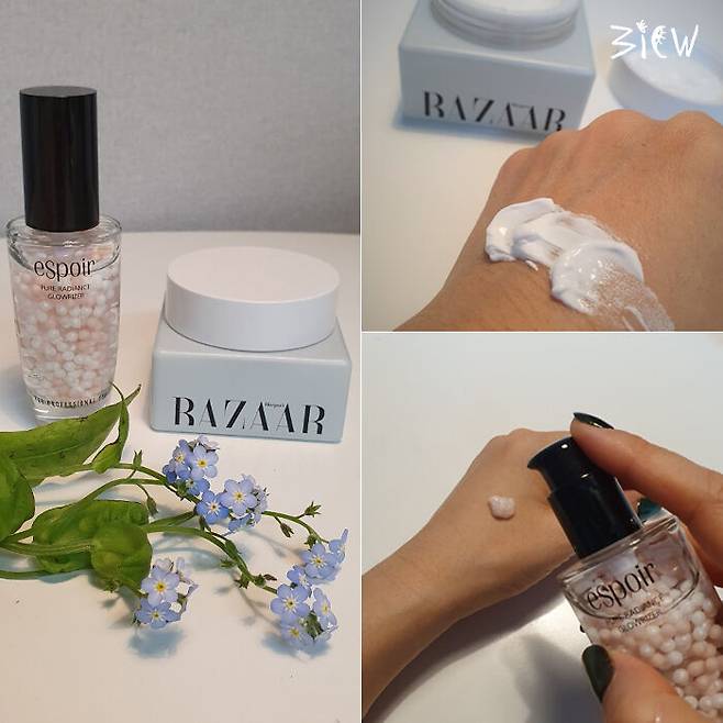 수분 충전과 탄력 케어를 위한 기초 케어를 마친 후 데일리로 꼭 챙겨바르는 제품들은 ‘광채’를 내는 제품들이에요. 톤업 크림이나 프라이머 등 색조 전 단계의 제품 중에 골라 이것저것 써보다가 최근 정착한 것이 바로 이 두 제품이에요. 하퍼스 바자 코스메틱의 톤업 프라이머는 바른 직후 삭 올라오는 수분감이 눈으로 확인될 정도로 촉촉해서 합격! 에스쁘아의 글로우라이즈 역시 수분감과 함께 광채를 올려주는 제품이라, 기분에 따라 골라 쓰고 있어요.