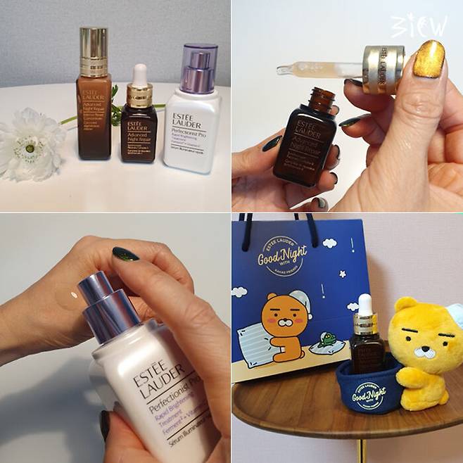 3040 언니들이 안티에이징 하면 가장 먼저 떠올리는 제품은? 바로바로 에스티로더 나이트리페어 제품. 말 그대로 안티에이징계의 여왕, 넘사벽 브랜딩 제품이죠. 한 방울만으로도 즉각적 효과를 느낄 수 있는 건 물론이고, 바르는 순간 얼굴만이 아닌 온 몸에 바르고 싶은 충동이 느껴질 만큼 피부결이 부드러워지는 걸 느끼게 해주는 제품이에요. 이번에 큰 맘 먹고 라이언 리미티드 에디션 갈색병과 신상 세럼도 하나 데려왔어요. 텅장각이지만, 내 피부는 소중하니까요!