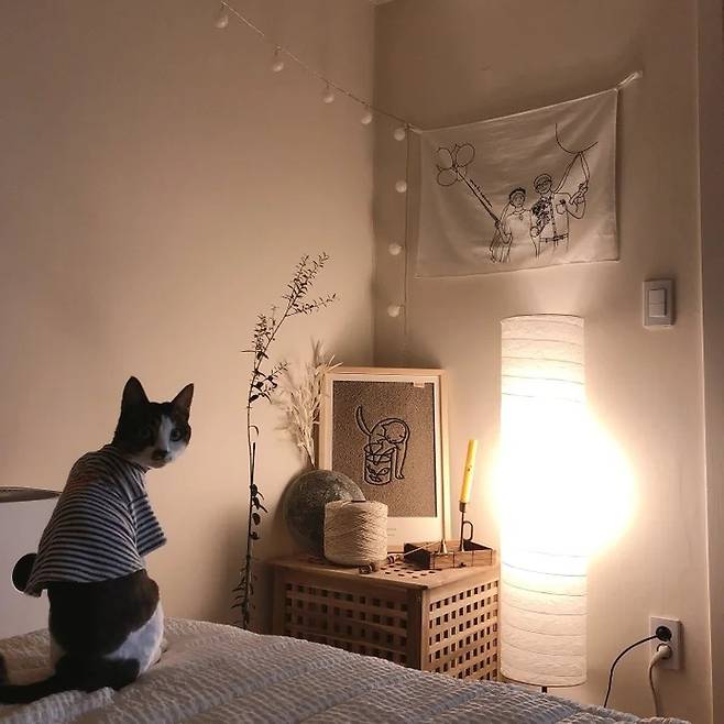 은은한 조명으로 아늑한 방의 분위기도 살리고 그 위로는 저희의 웨딩사진 일러스트 패브릭을 걸어놔서 따뜻한 느낌도 나고 더 의미가 있네요.
