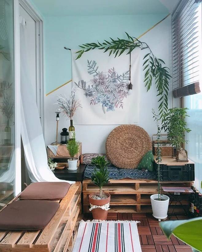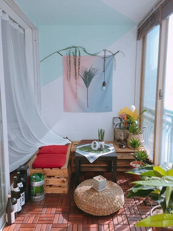 우리 집에는 조금 특별한 공간이 있어요. 결혼을 하면서 베란다에 남편과 함께 즐길 수 있는 공간을 마련했어요. 계절에 따라, 소품에 따라 꾸몄던 공간이 최근에는 휴양지 콘셉트로 자리 잡게 되었네요.