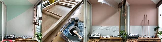 베란다는 처음 입주 때부터 리모델링 업체에서 1도 손대지 않고 셀프로 진행되었어요. 그래서 페인트칠하는 것도 어색하지 않았답니다 :) 기존의 차가운 색상을 없애고 따뜻함을 주려고 주문했던 페인트가 저의 의도와는 다르게 핑크톤을 많이 띄었는데 결과는 색상이 예쁘게 나와서 만족한답니다.