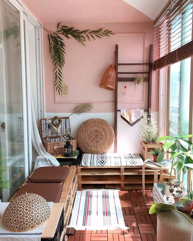그렇게 변신한 베란다는 현재는 핑크색 벽에 라탄의 소품들과 어우러져 휴양지 느낌 나는 공간으로 재탄생했어요.