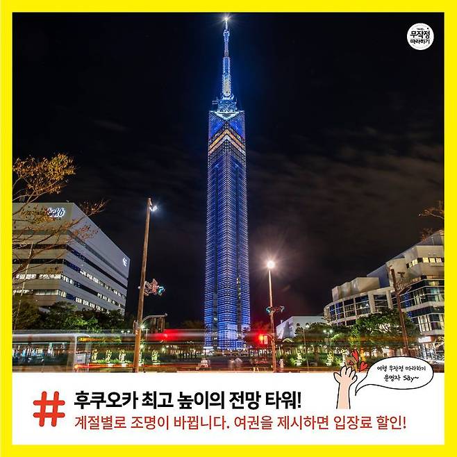 후쿠오카 최고 높이(전망층 지상 123m)의 전망 타워예요. 계절별로 야간경관 조명이 바뀝니다. 여권을 제시하면 입장료 할인!