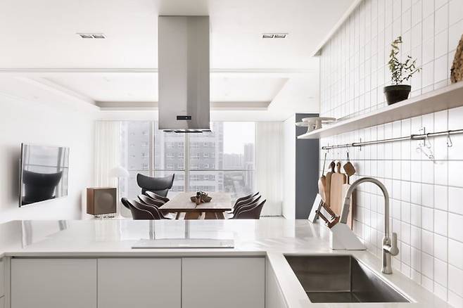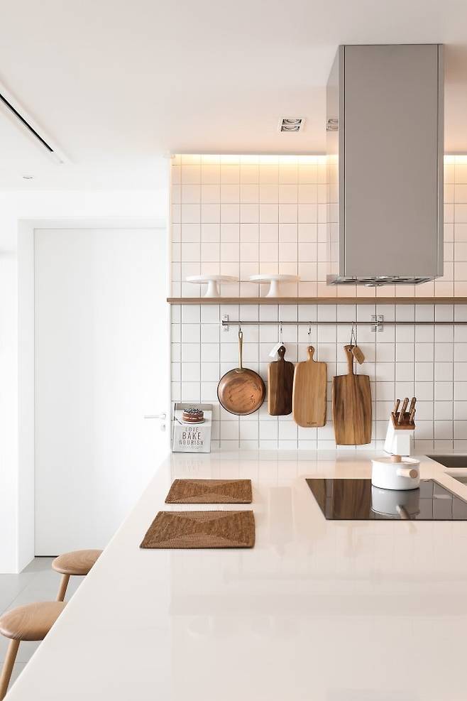 전체적으로 화이트 톤으로 꾸민 주방입니다. 타일부터 싱크대와 상판까지 모두 흰 계열로 마감해서 굉장히 심플하고 깔끔해보이죠. 타일은 백색 사각 타일로 귀여운 느낌을 더해주었고요. 올 화이트 주방의 경우 너무 차가워 보이는 경향이 있을 수 있기에 우드 선반과 나무도마, 라탄 소품을 사용해 따뜻한 분위기를 더해주었습니다.
