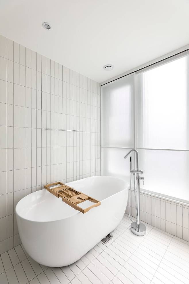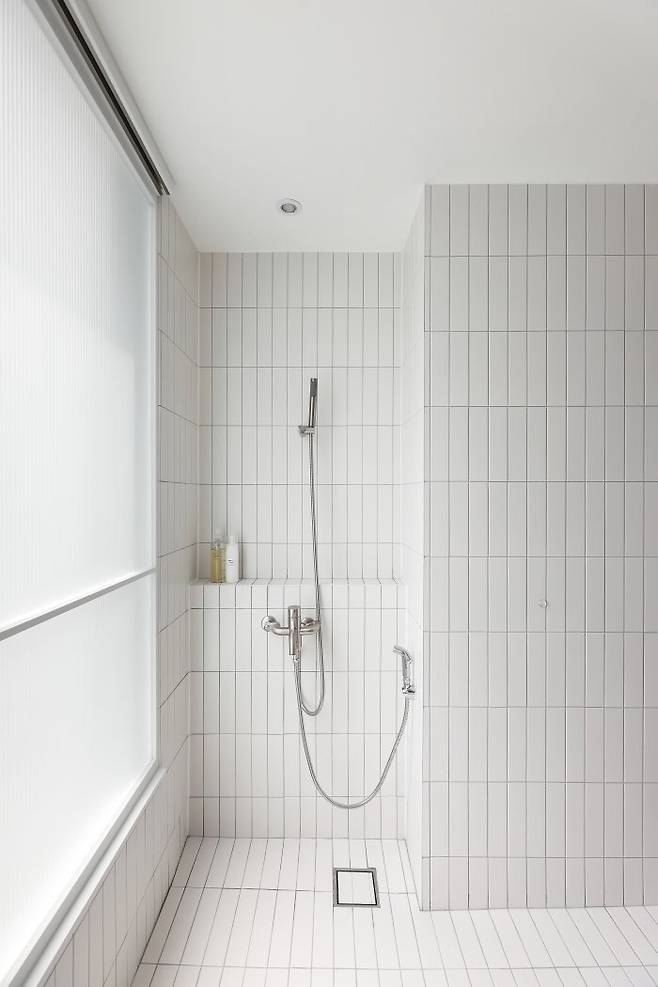 목욕공간은 하얀타일로 단순하게 시공하여 밝고 깨끗한 느낌을 주었고, 커다란 창에는 덧창을 시공하여 외부로부터 시선을 차단했습니다. 넓은 창에서 들어오는 자연광이 참 잘 어울리는 욕실공간입니다.