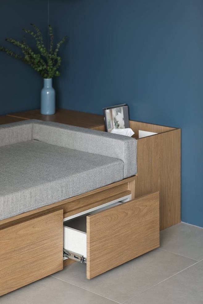 데이베드 곳곳은 수납이 가능하도록 제작했는데요. 아랫부분은 슬라이딩서랍으로 부피가 꽤 있는 물건들도 손쉽게 보관할 수 있습니다. 팔걸이쪽 부분에도 수납공간을 마련해 잡지나 리모컨 등을 깔끔하게 넣어둘 수 있죠. 따로 거실장 없이도 데이베드 하나에 휴식과 수납을 해결할 수 있어 실용적입니다.