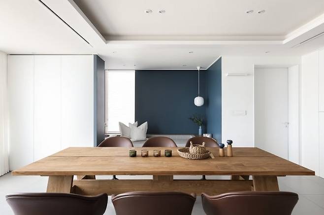 거실 중앙을 차지한 다이닝 테이블은 묵직한 존재감으로 멋을 더해주는데요. 원목 소재의 테이블에 레더 체어를 셀렉해 고급스러우면서도 중후하고, 편안한 느낌을 강조했습니다. 테이블 가운데에는 향초와 자그마한 라탄 바구니와 촛대를 배치해서 허전하지 않으면서도 깔끔해 보일 수 있도록 약간의 데코를 더했죠.