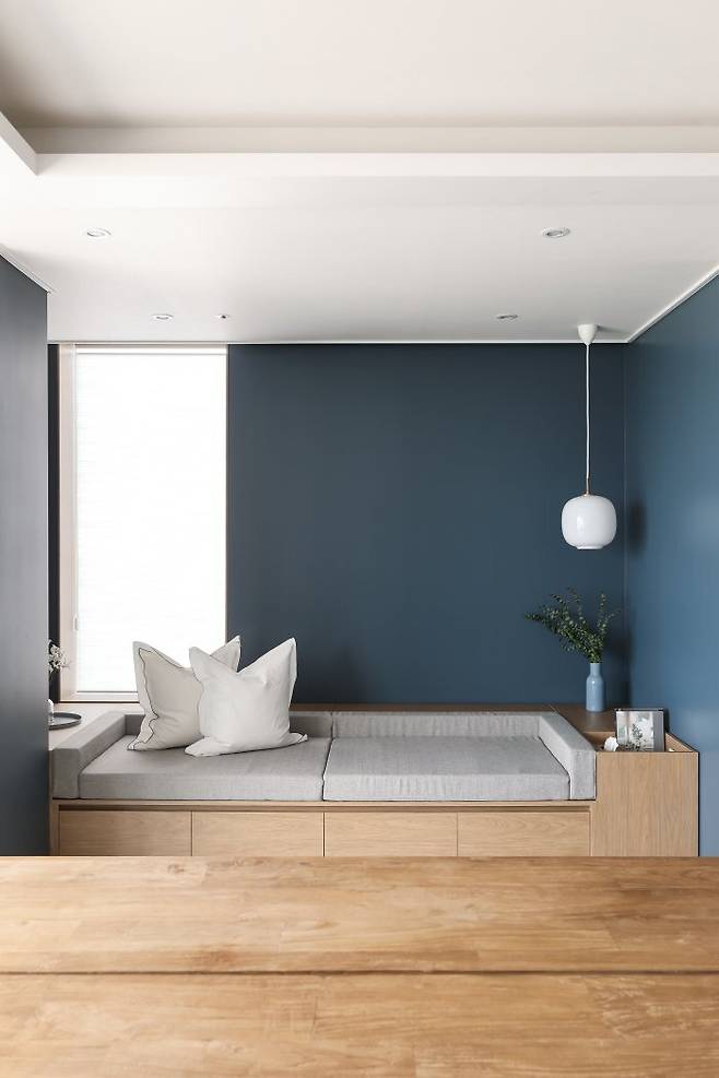 일반적인 거실과 같은 소파 대신 조금 특별한 느낌으로 제작한 데이베드입니다. 마치 리조트에 온 것 같죠? 데이베드쪽 벽면은 톤 다운된 블루톤으로 눈이 시원하고 편안할 수 있도록 연출했습니다.
