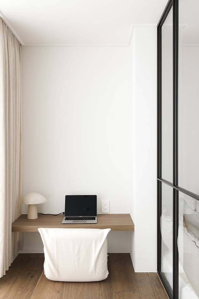 이렇게 침실 뒷편으로 아늑한 노트북 공간이 만들어졌죠. 화이트 커버의 좌식의자를 배치해 자연스러운 멋이 더해졌습니다. 햇살 좋은 날 이곳에 앉아 커피를 마셔도 너무 편안한 기분이 들 듯한 공간입니다.