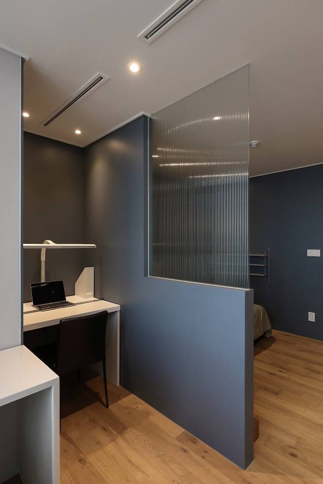 가벽파티션은 솔리드하게 마감하기보다 유리소재를 끼워 넣어 빛을 투과시키면서도 공간감은 분리될 보일수 있도록 연출했죠. 가벽으로 인해 책상이 독립적인 공간으로 분리되면서 더 집중할 수 있는 환경이 완성됐습니다.
