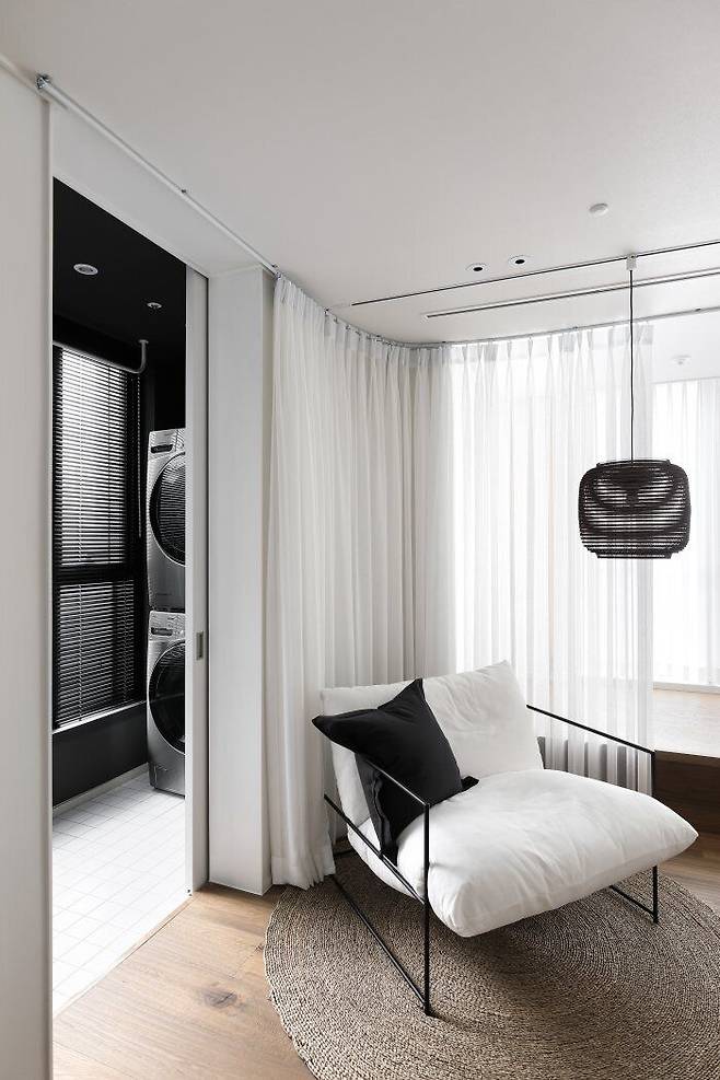 침실과 세탁실로 연결되는 문은 불투명한 화이트 슬라이딩도어를 사용해서 평소에 닫아두면 벽처럼 보일 수 있도록 했고, 그 앞에 커튼레일을 달아 커튼을 치면 공간이 더욱 아늑하고 로맨틱해보일 수 있도록 구성했습니다.