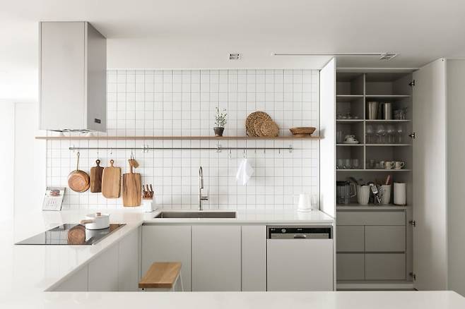기존 주방에는 세탁실이 딸려 있었는데요. 세탁실을 안방 발코니로 옮기고, 공간이 협소한 주방 구조를 변경해서 펜트리장으로 채워 넣었습니다. 덕분에 요리를 하는 메인 주방과 식자재와 많은 양의 식기를 보관할 수 있는 수납공간이 늘어나게 됐죠.