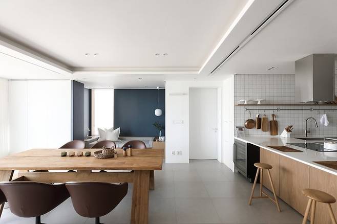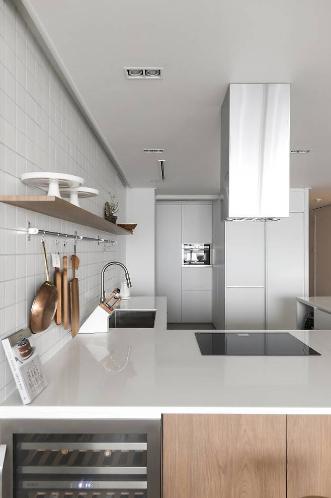 와인을 좋아하시는 클라이언트를 위해 와인냉장고는 거실 쪽으로 방향을 틀었고, 자주 사용하는 와인잔 역시 숨은 공간을 활용해서 수납할 수 있도록 했습니다. 거실쪽 아일랜드 하부장은 역시 우드톤으로 마감해서 우드&화이트 톤앤매너에 힘을 실었죠. 보다 내추럴하고 자연스러운 무드가 더해져 아늑한 느낌이죠.