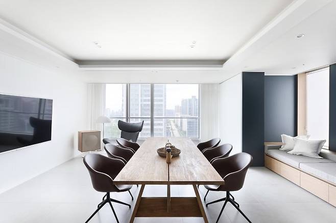 고객님께서는 손님들을 자주 초대하시는 편이어서 거실에 커다란 테이블 배치를 원하셨는데요. 그 니즈를 충족하기 위해 테이블 이외에 가구는 최대한 배제 하고 벽과 바닥은 최대한 미니멀하게 진행하였습니다. 데드 스페이스는 수납장을 짜서 넣고, 확장한 일부 공간엔 널찍한 데이베드를 제작해드렸습니다.