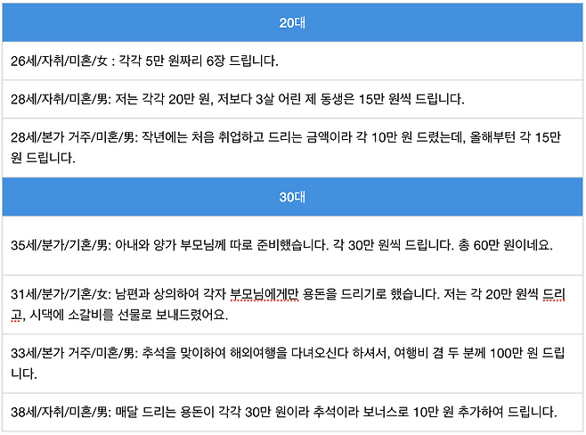 다가오는 추석 명절 가장 큰 지출은 무엇인가요? 구인구직 매칭 플랫폼 사람인 직장인 2040명을 대상으로 '추석 연휴 예상 지출 비용'을 비교한 보고서에 따르면 평균 35만 원의 지출이 있을 예정이라고 합니다. 부모님 용돈, 선물 구입 비용, 외식, 여가 등 추가 지출 등을 모두 합한 비용입니다. 아마 다양한 지출 중 가장 고민인 것은 바로 '부모님 용돈'일 것입니다.