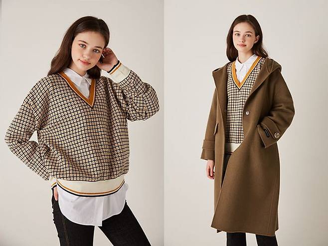 발랄한 겨울 니트룩엔 체크 무늬의 브이넥 니트가 정답이다. 통통 튀는 컬러의 니트는 배색 체크 패턴이 포인트가 돼 경쾌한 매력을 한껏 상승시켜준다.