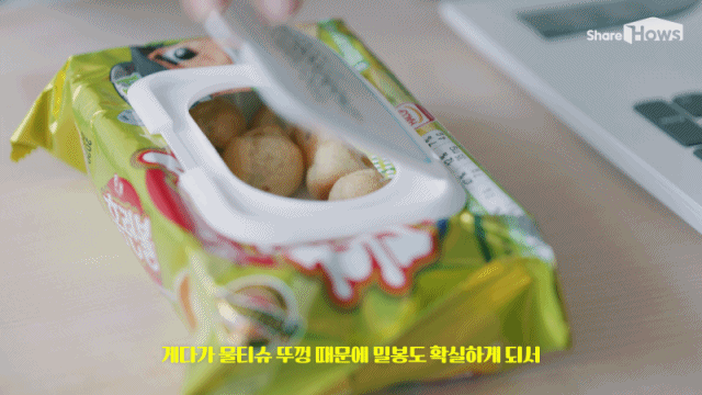 게다가 물티슈 뚜껑이 확실하게 밀봉해줘서 과자가 눅눅해지지 않아요!
