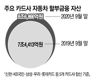 빚을 내 수입차 구매에 나서는 사례도 급증하는 추세다. 이날 금융감독원 금융통계정보시스템에 따르면 자동차 할부금융 서비스를 운영하는 카드사 5곳(신한·KB국민·삼성·우리·롯데)의 신차·중고차 등을 포함한 자동차 할부금융 자산은 지난해 9월 기준 총 8조6866억원으로 집계됐다. 이는 2019년 3분기 7조4413억원보다 16.7%(1조2452억원) 증가한 규모다.