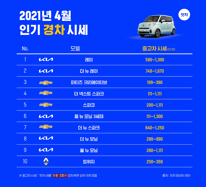 봄에는 전통적으로 이직과 취업 등에 의해 차량 수요가 증가해 왔어요. 급하게 자차를 장만해야 하는 사람들도 많고, 적은 예산으로 중고차 시장을 주시하는 눈도 무수해요. 따라서 다른 차급에 비해 경차의 인기가 상승하는 계절인데요. 오늘 첫차 데이터 연구소에서는 지난 한 달간 판매된 경차들의 시세와 인기 순위를 알아보았어요. 함께 볼까요?