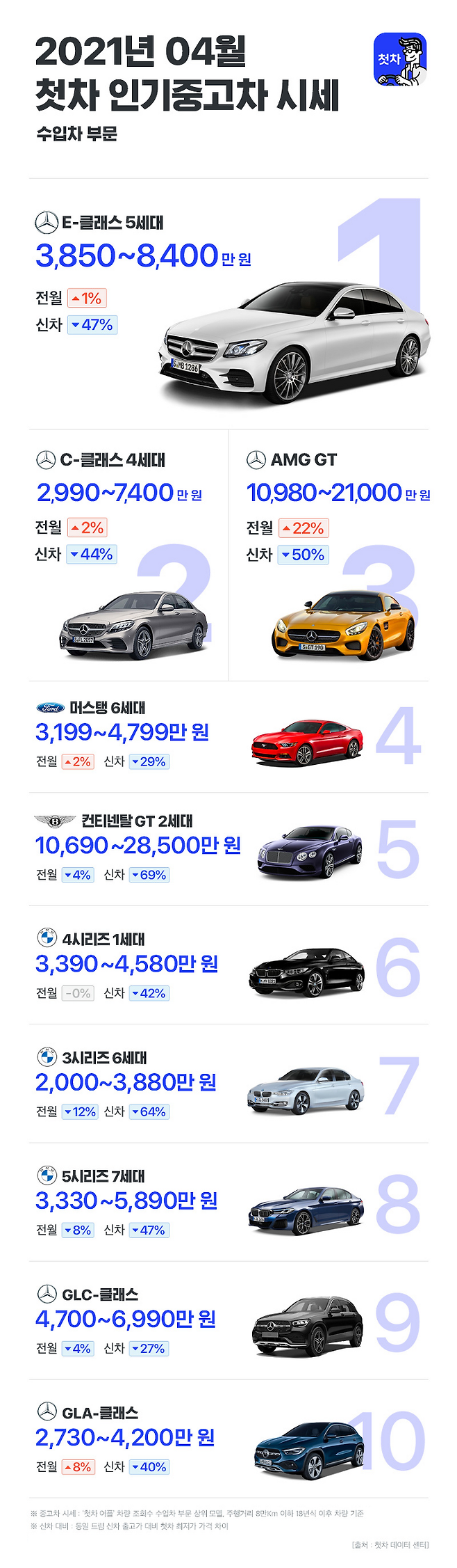 나란히 1위와 2위를 차지한 벤츠의 중고차들, E-클래스와 C-클래스예요. 거의 국민 수입차나 마찬가지인 E-클래스는 중고차 시장에서도 질세라 뜨거운 반응을 얻고 있어요. 한 가지 슬픈 소식은 인기가 대폭 상승하면서 가격 또한 다소 오르고 있는 상황인데요. 상단의 표를 보시면, 판매된 모든 차량에 대한 전월 대비 시세 상승률은 1%였지만, 상위 가격 5대를 제외한 나머지 차량들을 놓고 비교했을 때엔 오히려 4% 하락했어요. 이 말인즉, 3월에 비해 4월에 고가의 E-클래스가 더 많이 판매되었고, 그들을 제외한 나머지 매물들의 시세 상승은 미미하다는 점이에요. 그러니 최상위 트림의 신차급 풀옵션완전체 차량을 노리고 있는 것이 아니라면 아직은 안심해도 좋을 것 같아요.