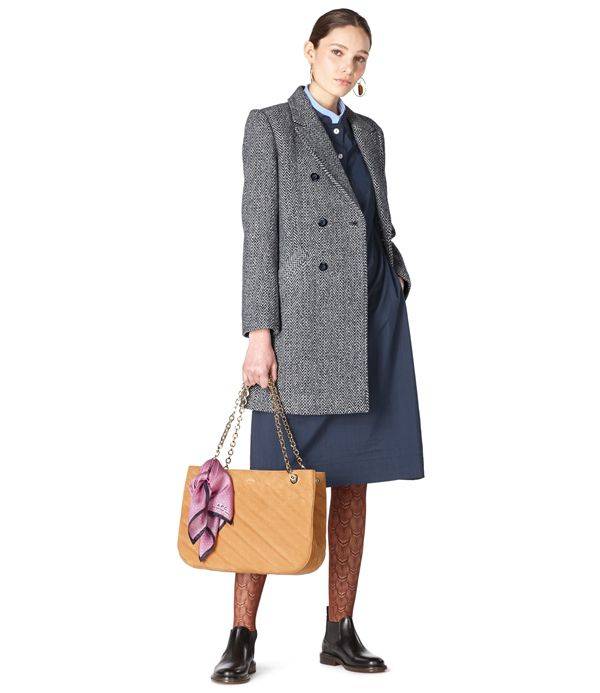 송혜교가 선보인 코트는 「A.P.C.(아페쎄)」 제품이다. 헤링본 패턴이 돋보이는 울 소재에 탑스티칭 처리한 테일러드 칼라와 더블 단추 디테일이 포인트로 들어가 멋스럽다.