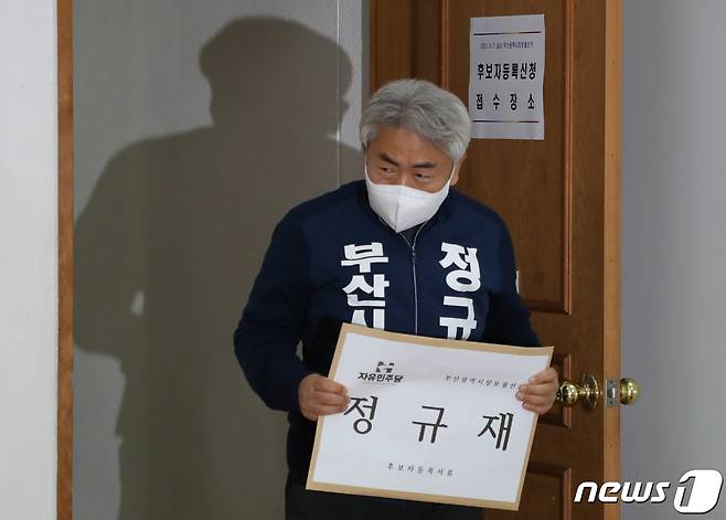 (부산=뉴스1) 여주연 기자 = 부산시장 보궐선거 후보등록 날인 18일 오전 부산 연제구 부산시선거관리위원회에서 정규재 자유민주당 부산시장 후보가 후보등록을 하고 있다. 2021.3.18/뉴스1