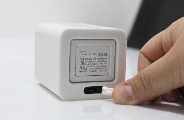 하지만 사운드 트윈의 배터리를 충전할 때에 사운드 트윈을 결합한 상태에서 한 쪽으로 충전하는 시스템이 아니라는 점이 큰 약점이다. 다시 말하면 두 대의 스피커에 각각 충전을 따로 해줘야 한다는 의미다. 스테레오 스피커로 듣다가도 하나의 스피커의 배터리가 다 닳게 되면 또 다른 스피커로 계속 들을 수 있다는 것이 장점이 될 수도 있겠다. 그러나 각각의 스피커를 따로 충전해줘야 하기 때문에 시간이 두 배로 들고, 상황에 따라 2개의 충전기로 충전해야 할 수도 있다. 물론 사운드 트윈을 동시에 충전할 수 있도록 두 개의 마이크로 5핀을 하나의 USB 포트에 연결한 케이블을 기본으로 제공하고 있다.