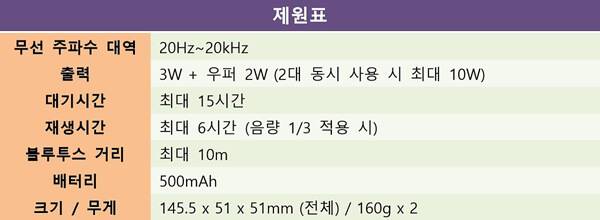 그렇다고 해서 성능이 뒤떨어지는 것도 아니다. 작은 몸집에 비해 정말 강력한 사운드 출력을 뽐낸다. 3W 출력에 우퍼 2W를 더해 최대 5W의 풍부한 사운드를 즐길 수 있는 데다가, 두 대의 스피커를 모두 사용하여 스테레오 스피커로 사용할 때는 최대 10W 출력을 지원한다. 이 정도면 주변 소음이 심한 야외에서도 영화, 드라마까지 충분히 시청할 수 있을 정도다. 여기에 IPX4 등급의 기본적인 생활 방수를 지원해 야외 활동에 적합한 모든 기능을 갖췄다고 해도 무방하다.