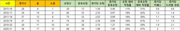 2020-21시즌 : 22골 17도움 (리그 17골 10도움)