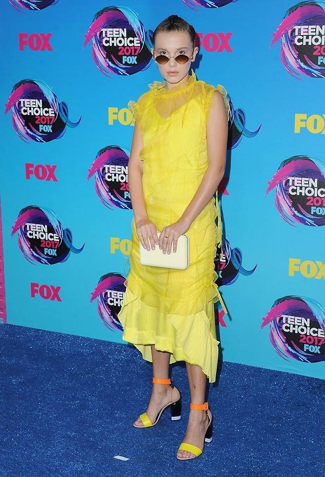 11. 틴 초이스 어워즈 2017에 참석한 밀리 바비 브라운은 크롬 하츠 원형 안경에 활기넘치는 겐조 러플 드레스를 입었다