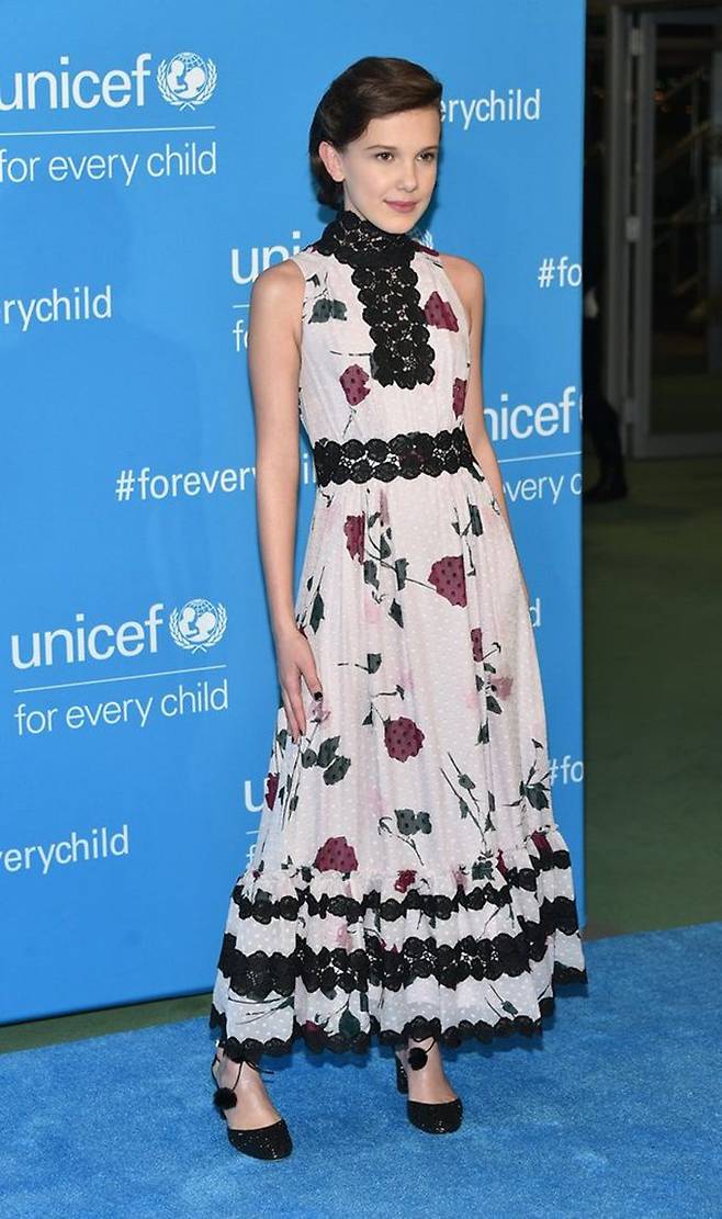 16. 유네세프 70주년 기념식 행사에 참석한 밀리 바비 브라운은 레이스를 덧댄 플로랄 가운에 반짝이는 키튼 힐을 매치했다