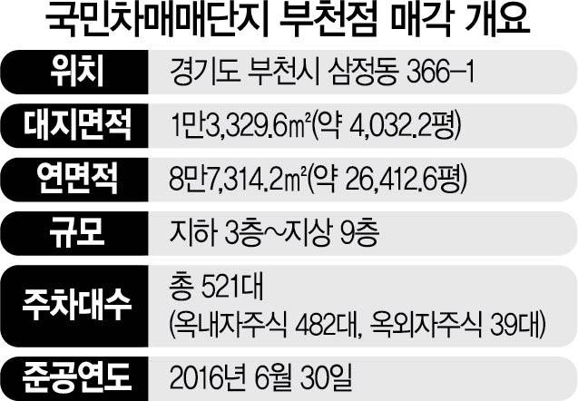 시장에서는 국민차매매단지 부천점의 몸값이 약 1,000억 원 안팎에 달할 것으로 예상하고 있다.