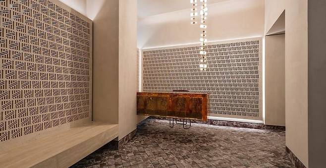 건물 전체와 호텔 디자인은 건축가 마르코 코스탄치(Marco costanzi)가 맡았다. 그가 호박으로 만든 미술품을 비롯해 펜디 로고를 본떠 만든 패턴이 그려진 벽이 투숙객을 맞이한다. 바닥은 로마의 전통적인 자갈길을 재현했다고. 로비에서는 펜디 브랜드 관련 서적을 비롯해 예술 및 디자인 관련 서적을 읽어볼 수 있다. 로비에서부터 펜디의 브랜드 감성을 충분히 느낄 수 있도록 꾸며진 공간이다.