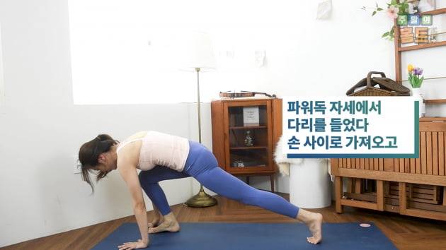 파워독 자세에서 다리를 들었다 손 사이로 가져오고