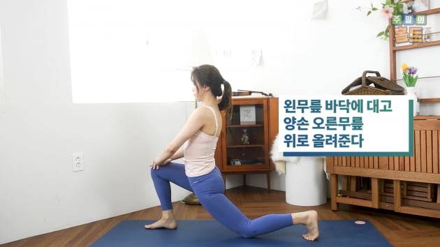 왼무릎 바닥에 대고 양손 오른무릎 위로 올려준다.