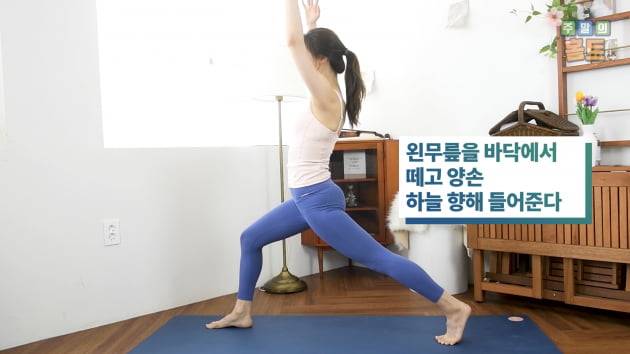 왼무릎을 바닥에서 떼고 양손 하늘 향해 들어준다.